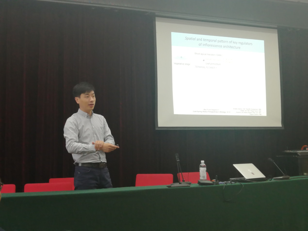 朱杨教授在报告中首先介绍了植物株型特殊的生物、生态和农业的意义,指出研究茎尖分生组织如何根据内部发育信号和外部环境决定花序发育方向是影响株型建成的关键科学问题。随后又介绍了自己博士及博士后期间的研究结果:高等植物成花素家族基因FT和TFL1保守存在,且对有限/无限生长株型起重要作用。通过ChIP-Seq和RNA-Seq,首次揭示了FT和TFL1双向决定理想株型的直接下游基因和各个调控通路的交错影响。利用植物避荫机制上调成花素FT表达,阐明了有限生长和花发育是通过FT-FD转录复合体特异性上调花发育基因LFY所实现的;在无限生长和花序发育需求下TFL1-FD直接抑制LFY。调控FT和TFL1能从优化株型方面提高适应性,可能引发作物的第二次“绿色革命”。以国家重大战略需求为导向,利用全球甘蓝型油菜核心种质,挖掘跟生育期和株型相关的FAL基因,精准编辑主效目的基因,实现油料作物油菜的设计生物育种。