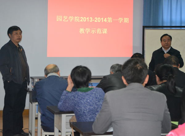 2013-2014第一学期教学示范课讲评活动。教学示范课讲评活动由院长冯建灿主持,教务处副处长化青报,校级教学督导杨明亮,张玉龙应邀参加了讲评活动,教学示范课分别由蔬菜学科带头人孙治强教授和果树学科带头人吴国良教授主讲,肉番
