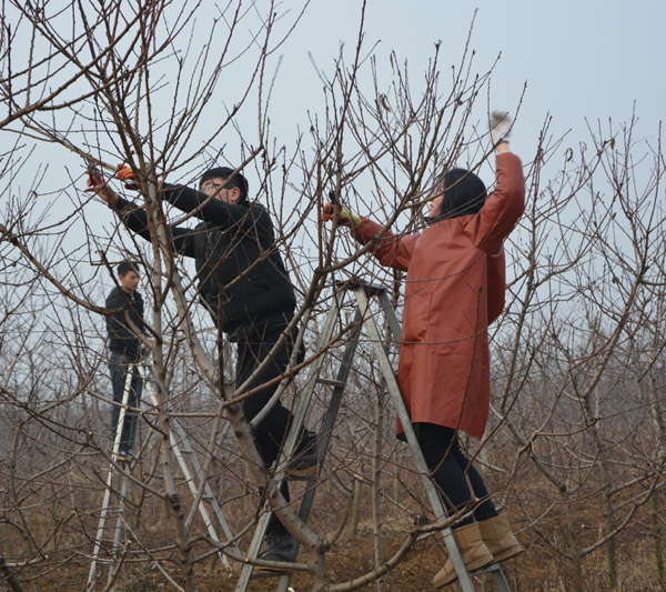 院长冯建灿一行在果园里观察巡视一圈儿后,领队老师把同学们都集中到一起,冯建灿对同学们的修剪进行了指导评议,并对实习效果提出了明确要求,他指出,本次实习条件艰苦,机会难得,同学们在这大冷天到离校近千里的野外实习,一定不要辜负了自己的辛苦、老师的心血和学校高标准人才培养的目标期望,要带着“为什么”,“怎么做”和“从什么地方改进和突破”这3个问题去完成本次的实习任务。首先同学们要明白为什么要来实习,下剪之前要想一想为什么要从这里下剪而不从那里下剪,不同果树为什么要修剪成不同的树型等等,多给自己、给老师提一些问题,然后联系课堂知识,决定当下该怎么做,探寻怎么做才能省时省力、高效快捷,同时还能保持修剪后的果树持续强壮且丰产丰收,最后还要想一想,目前我们的修剪方法、技术,工具是不是最好的,还有没有办法或是从哪方面进行突破可以让这项工作更轻松更省事,从而不断寻找探索,促成以后的实用发明和实践创新。总之要多动脑,多动手,多提问,多实践,充分把握眼前机会,理论联系实际,努力提高生产实践技能,长知识,增本领,为将来打下坚实基础。