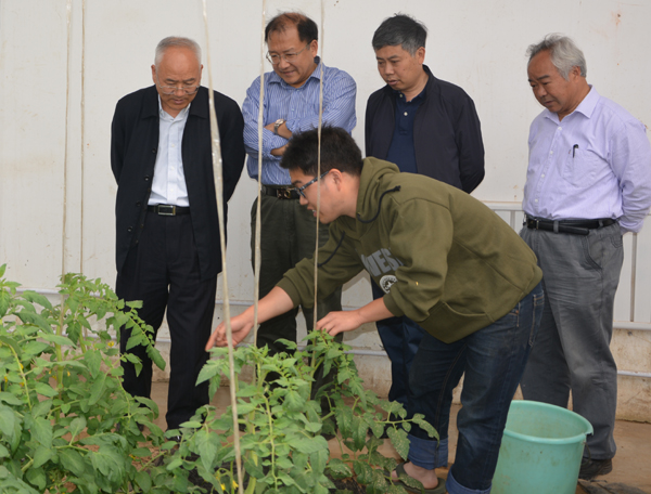 副院长孙治强、副院长马长生、校特聘教授杨路明等分别带领谭校长一行视察了肉番育苗温室和无土栽培实验温室,查看了番茄、黄瓜、辣椒、甜瓜和西葫芦育种实验大棚。谭金芳对肉番基地建设工作给予了肯定,对一些先进技术的使用表示赞赏,同时也对一些实验设计和新技术的使用提出了建设性意见和可行性建议。在视察肉番校特聘教授杨路明的西甜瓜种质资源收集与创新的实验大棚时,谭金芳仔细倾听了杨教授对来自45个国家的黄瓜种质资源特性介绍与创新实验设计,详细地询问了下一步研究计划,并通过对其劳动的充分肯定鼓励其不懈攀登,为冲刺更高层次人才和取得更高水平科研成果而努力拼搏。