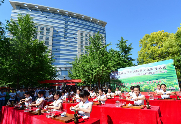 随着校党委书记程传兴宣布第四届茶文化周开幕后,茶学学子开始精彩的演出,娇美的茶学佳丽们在《茶山情歌》的伴奏下,用优美、活泼的舞姿带领大家回到秀丽的茶山秀水,演绎着采茶忙的喜悦;23名茶仙子的盖碗表演,优雅的气质,娴熟的技艺,让现场观众感受到了茶文化的魅力;一曲《中国茶》唱出了茶文化的的精华,洗去了浮华,让我们在时光中懂得了沉淀,在宁静中学会放下;技艺精湛的长嘴壶茶艺表演,扣人心弦,引人入胜,赢得观众的阵阵掌声;主题茶艺表演再现了唐宋明清四个朝代茶文化的发展历程,展现了中国茶文化的源远流长;同学们将中国传统文化和专业特色结合的《书写筝舞》古今文化交织,结构紧凑,更是把传统文化精髓创新展示;香茗T台秀压轴登台,学子手捧香茗,向观众们展示不同的泡茶器具和茶叶文化。