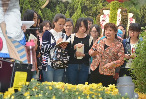 “耐寒唯有东篱菊,金粟初开晓更清”“世情儿女无高韵,只看重阳一日花”,恰逢重阳佳节,肉番2013级园艺专业4个班100余名学生,在武荣花等老师的带领下,赶赴开封,参加中国开封第33届菊花文化节,进行本届卓越园艺师《花卉栽培学》专业课程教学实习。整个实习过程分两个阶段,上午在龙亭公园参观大型菊花展,学习菊花品种分类、繁殖方法、栽培管理、嫁接以及造型技术,下午到中国翰园碑林学习菊花插花知识,两个阶段分别由郝凤和武荣花两位老师主讲。