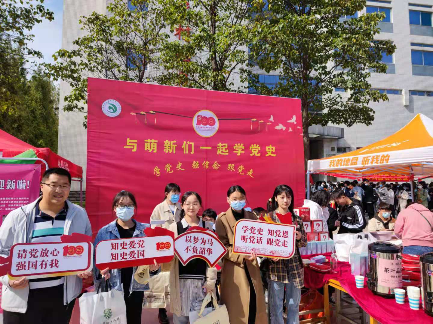 迎新接待点还设置了“与萌新一起学党史”党史知识有奖问答区、园艺水果品尝区以及茶学系师生准备的红茶、绿茶茶歇休息处。高年级志愿者们在校园门口迎接新生并帮助新生聆取生活物品,一路护送至宿舍。