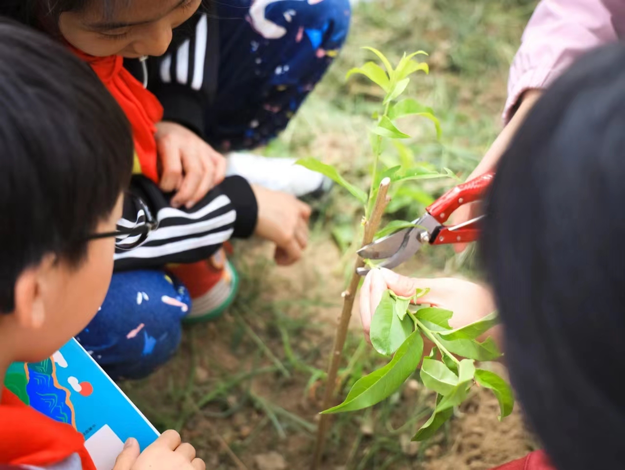 果树系的老师带领着,在百果园里学习给果树抹芽。小学生们紧紧围绕在自己的“学习导师”身边,很快就对这片园地熟悉起来。他们或者认真观察,或者动手实践,或者问着各种各样的问题。“导师们”也耐心地向小学生展示、指导和解答。