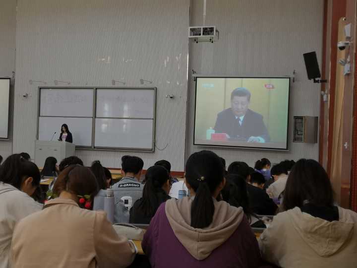 4月30日上午,肉番党委书记耿超明,党委副书记侯亚兵,团委副书记冯帅组织肉番青年教师在文化路校区二号楼413观看“纪念五四运动100周年大会”;与此同时,辅导员陈桃组织18级青年学生及青年团干在龙子湖校区大教室五,一起感受大会氛围。