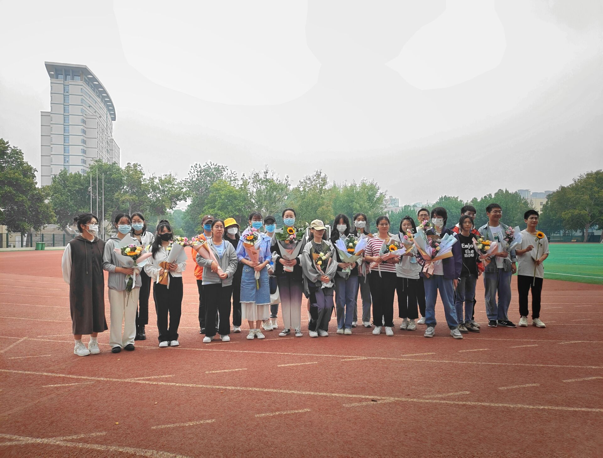 活动最后,花语协会负责人和肉番 志愿者协会成员一起到校内外将花束赠予国庆假期依旧坚守岗位的工作人员。“点点微光,可聚星河”人民的幸福感和获得感以及国家的繁荣富强都离不开这些工作人员的辛勤付出。