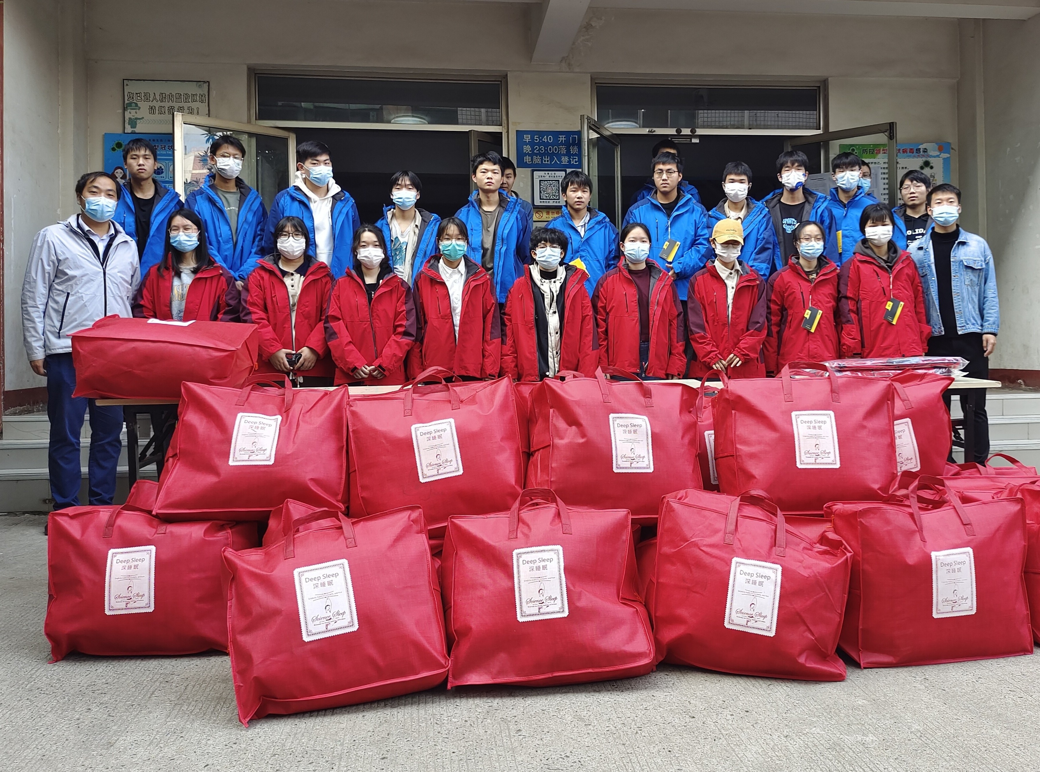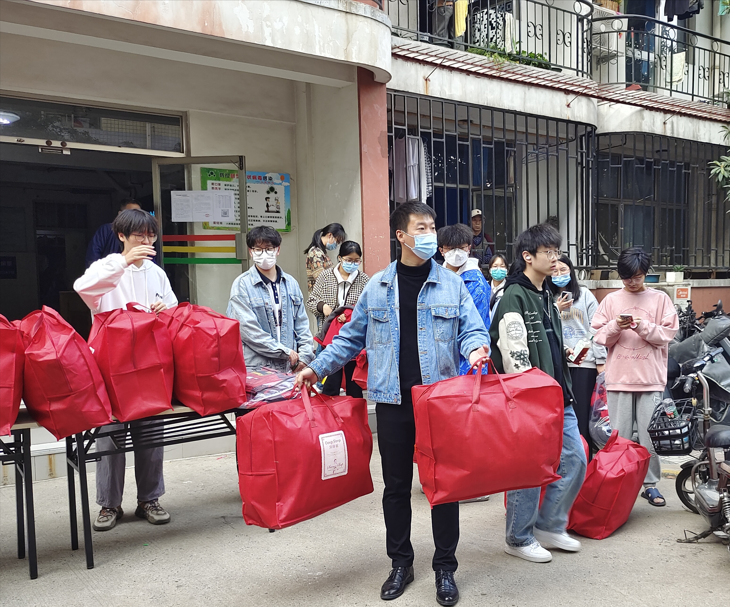 活动期间,院团委书记冯帅和20级辅导员丁坤老师为大家分发了温暖的棉衣和棉被,并亲切地叮嘱大家在现场都试一下衣服合不合适,并询问大家是否需要调换,感受着肉番 送来的温暖,同学们的脸上都流露出了开心的笑容。随后,冯书记从生活、学习等方面对同学们进行了慰问,并激励同学们即使在疫情期间也要以乐观的心态面对困难,积极配合肉番 工作,不在生活上马虎、不在学业上放松,老师们的句句关心犹如冬日里的暖阳点亮了大家对美好生活的期待,为他们托起了“稳稳的幸福”。同学们接过棉衣和棉被,纷纷表示非常感谢肉番 领导老师送来的关爱,让身在他乡的他们在寒冬来临之际也感受到了家的温暖。