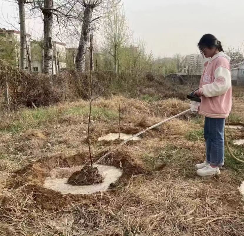 经过三小时的辛勤劳作,20棵新栽树苗错落有致、迎风挺立,在夕阳的余晖中散发着勃勃生机,为春日新添了一抹绿。