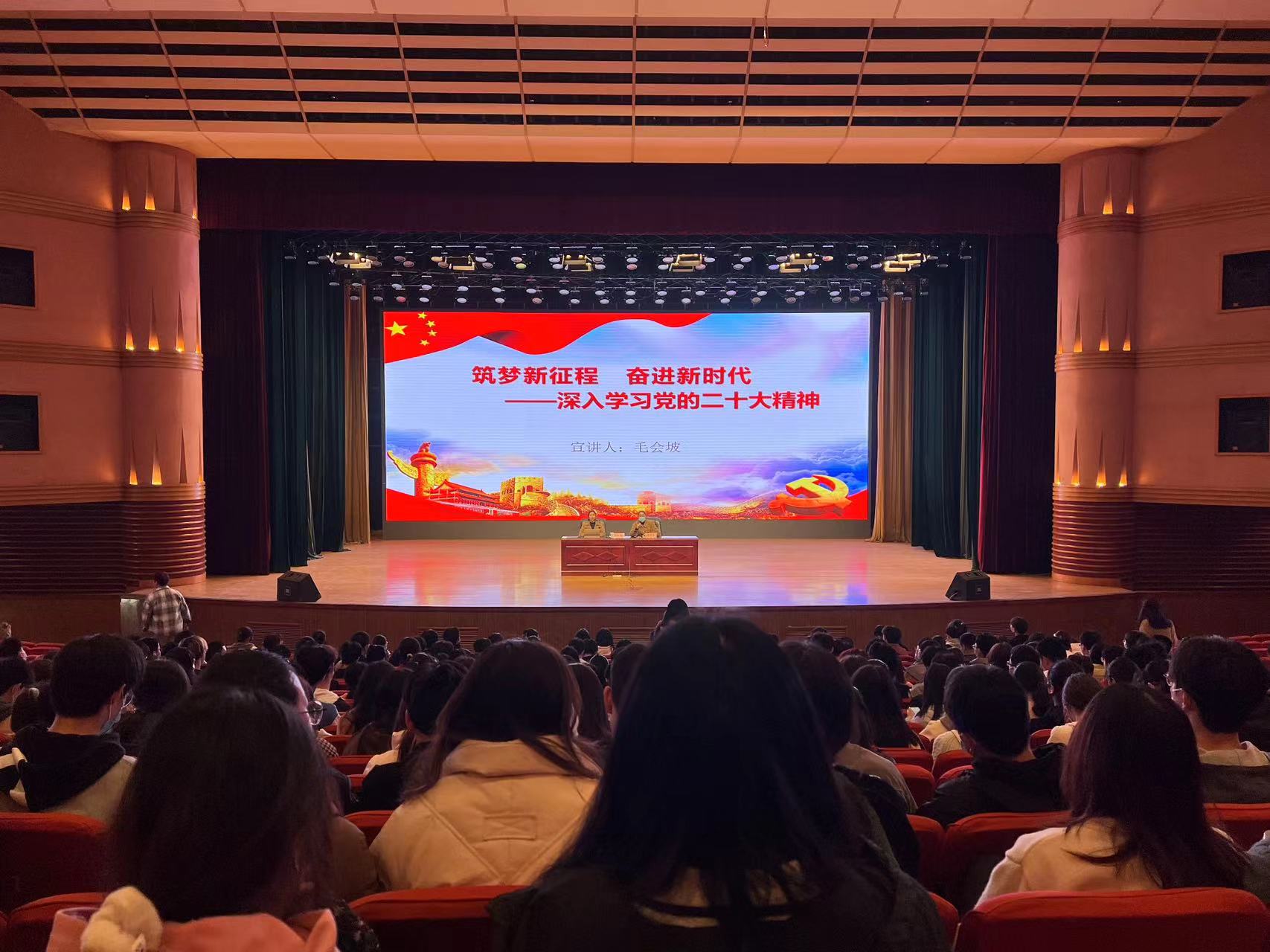 毛会坡结合自身学习体会,从党的二十大主题和主要成果、过去五年工作和新时代十年伟大变革的重大意义、以中国式现代化推进中华民族伟大复兴的使命任务、全面建设社会主义现代化国家的目标任务、党的青年工作等方面,对党的二十大精神进行了深入的宣讲辅导。宣讲会上,通过设置一些问题,引导同学们积极参与交流讨论,激励同学们认真学习贯彻党的二十大精神,深刻领会习近平总书记对青年人的期望和要求,争做有理想、敢担当、能吃苦、肯奋斗的新时代好青年。