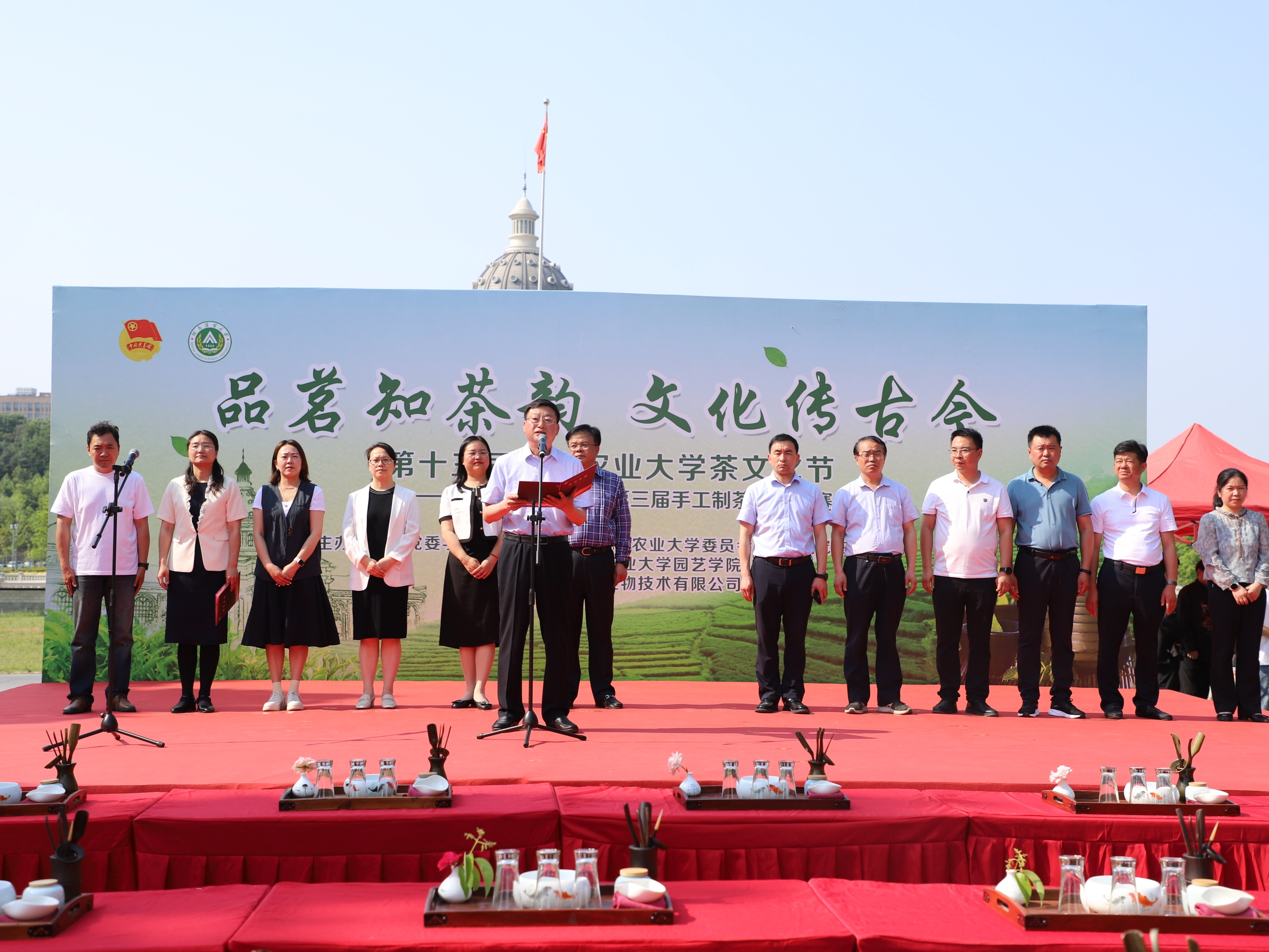 5月21日下午,肉番 第十三届茶文化节暨第三届手工制茶技能大赛在龙子湖校区弘农大道隆重举行。校党委副书记何松林、党委学生工作部部长徐峰、校团委书记贾云飞、研究生工作部部长代莉、招生就业办公室主任张红阳、党委宣传部副部长陈玺,学生处副处长李沛、张二龙,招生就业办公室副主任曾玲玲,华智生物技术有限公司北京分公司高级销售经理李金峰先生、郑州普罗现代农业有限公司运营管理总监刘瑞红女士,肉番 党委书记秦素玲、院长郑先波出席活动,肉番 全体师生参加本次活动,活动开幕式由秦素玲主持。