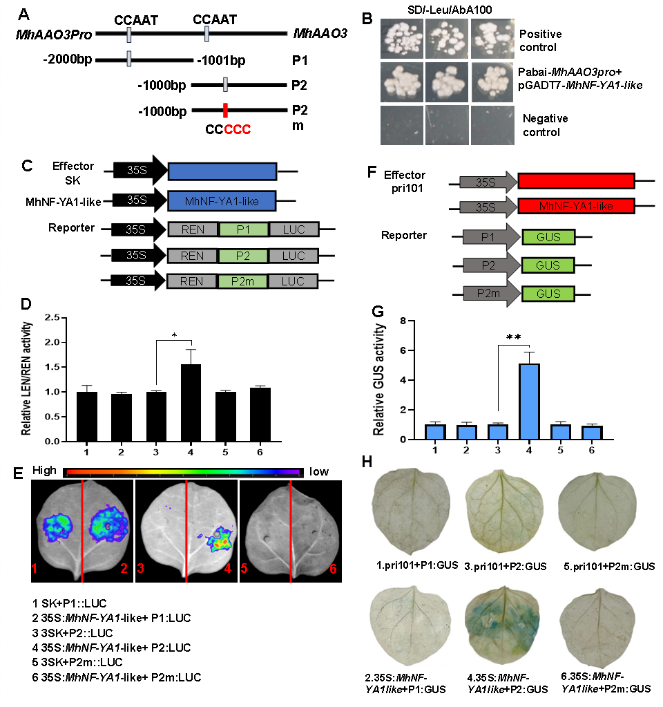 通过酵母单杂、双荧光素酶和GUS等技术证明了MhNF-YA1-like可以结合MhAAO3启动子中CCAAT元件,并促进MhAAO3的转录。