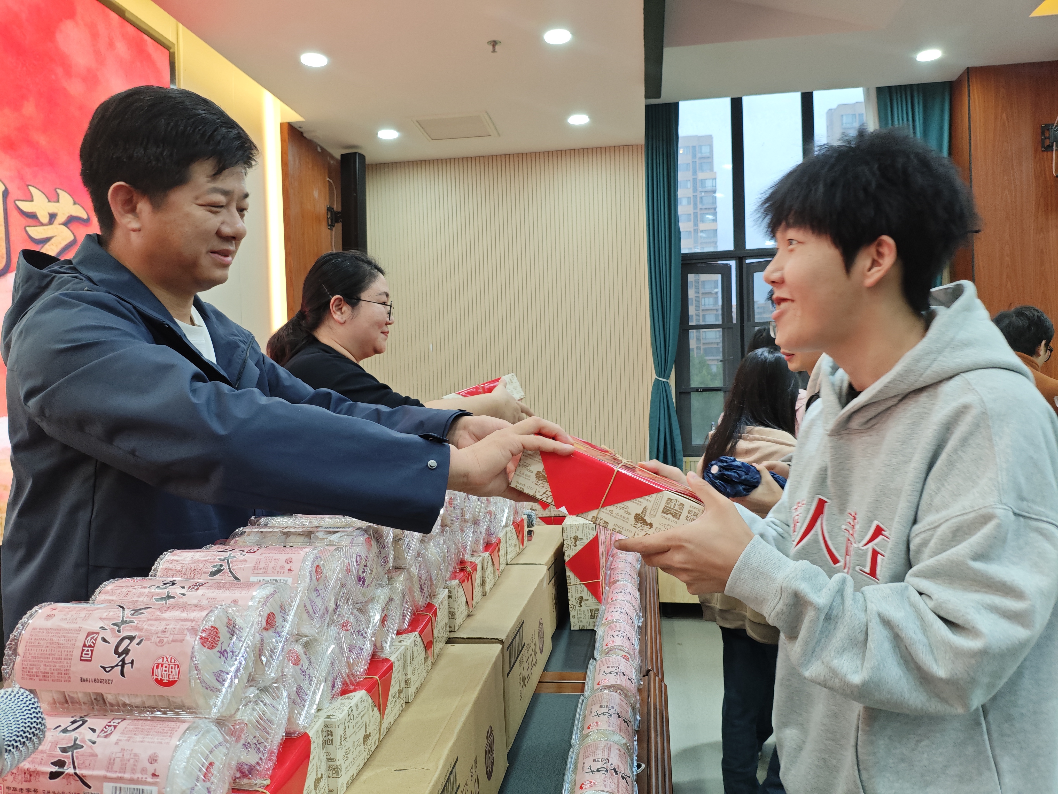 活动现场暖意融融,师生欢聚一堂共话中秋。老师们带领工作人员将准备就绪的物资逐一分发到每位学生手中:包装精巧的月饼藏着传统节日的团圆滋味,色泽鲜亮的苹果承载平安顺遂的美好期许,颗粒饱满的石榴象征多福多喜的吉祥寓意,每一份物品都满含学院对学子的牵挂。
