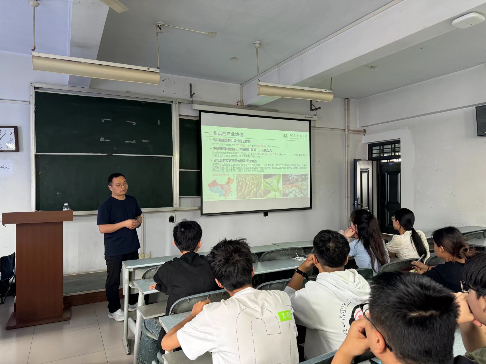 蔬菜系教授胡建斌为园艺类23-8班同学介绍甜瓜的分类、起源与驯化。胡老师告诉同学们,耕读论坛活动是面向学生,让师生之间、高年级与低年级之间相互交流,也相当于知识报告,为我们介绍专业、人生理想、科研成果等。