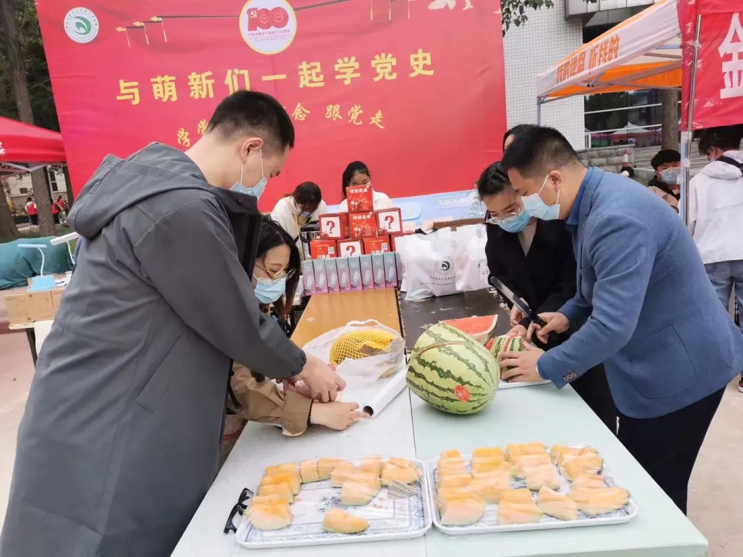 迎新接待点还设置了“与萌新一起学党史”党史知识有奖问答区、园艺水果品尝区以及茶学系师生准备的红茶、绿茶茶歇休息处。高年级志愿者们在校园门口迎接新生并帮助新生聆取生活物品,一路护送至宿舍。