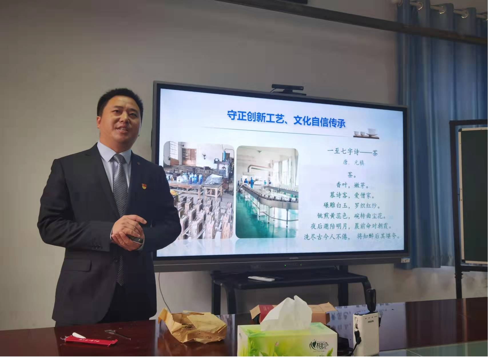 赵仁亮老师首先对从茯砖茶加工工艺流程、茯砖茶的加工关键技术—发花等方面进行课堂教学讲授,然后从教学内容分析、学情分析、教学目标、教法和学法、教学过程、教学反思等方面进行教学阐释。赵仁亮老师以其颇具感染力的情绪调动起课堂气氛,以翔实生动的实例展示茯砖茶的加工关键技术,整个模拟授课过程环节紧凑、脉络清晰,带给观摩老师新的感受。