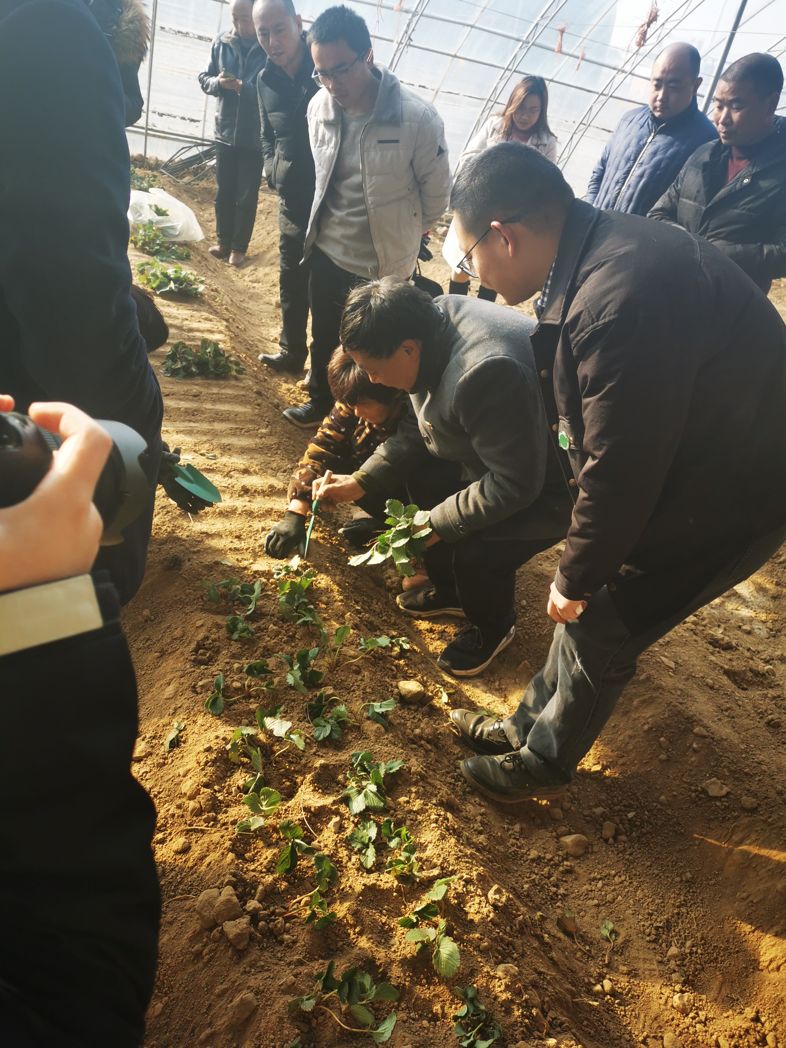 听说农大的专家来了,附近的村民们都纷纷赶来。草莓大棚里,挤了许多村民,他们都是为王吉庆教授慕名而来,王吉庆教授手拿草莓苗,现场手把手教他们如何刨坑、浇水、松土,村民们听的是频频点头。大棚外,郑先波教授开展桃树冬剪现场示范,为了让村民们能够听得懂、用得上、记得住这些技术,他用“摘帽子”、“三个一”等形象有趣的语言为村民们讲解桃树的冬剪技术,现场不时传来村民们的赞叹声。