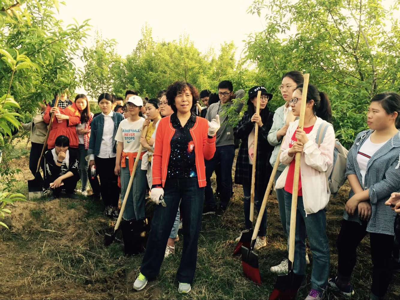 17级入党积极分子在辅导员陈桃的带领下于龙子湖校区"百果园"进行除草行动,特邀果树系教授陈延惠老师参与指导、现场教学。