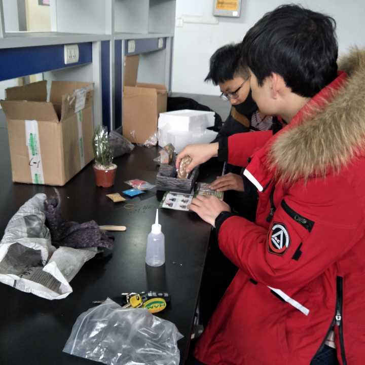 每个参与制作的团队由3-4人构成负责一个微景观制作,同学们耐心仔细,小心翼翼按照步骤在容器内先铺设青石、水苔、营养土等,后摆上新鲜苔藓,植入植物,用装饰砂石以及公仔和各种饰品进行布景。