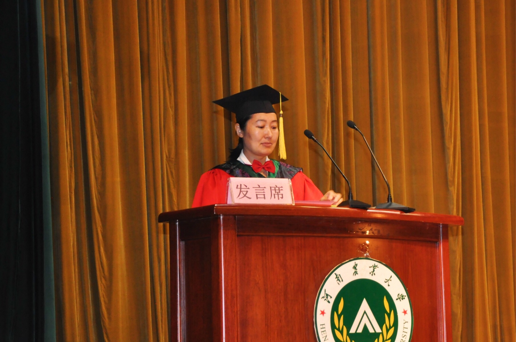 94届蔬菜系毕业生原玉香上台发言。原老师饱含深情地对母校表达了感激与热爱,她以自身经历为例对台下毕业生做出鼓励,用诙谐幽默的语言与台下学子亲切互动。