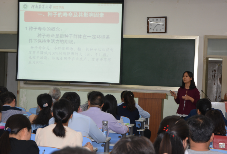 比赛一开始,郑主任宣布比赛规则,规定讲课比赛主要是表现教师讲课艺术和把控课堂的能力,每位参赛选手在10分钟的时间内把自己准备的讲课内容呈现出来。接着每位选手按照提前抽签的顺序依次上台讲课,比赛中贾芝琪博士主讲园艺植物育种学的引种部分,图文并茂的讲解了种质保存的重要性,以及我国乃至世界的种子保存库分布,周琼琼博士利用生动的动画演示展现了茶与茶文化在中国的演变,赵仁亮博士结合自己科研经历生动讲述了制茶工程学中茯砖茶的制作工艺,吴帼秀博士讲解了无土栽培的类型,王伟博士导入结语完整的讲解了园艺产品采后处理学中乙烯与果蔬成熟衰老的关系,董晓星老师仪态端庄的讲述了设施农业工程预概算,白团辉博士用一个问题引出果树栽培学中砧木的问题,并进行深入讲解,刘珂珂博士讲解了蔬菜栽培学中春化作用的重要性,谭彬博士讲解了园艺植物育种学的诱变育种。