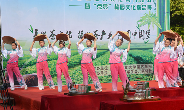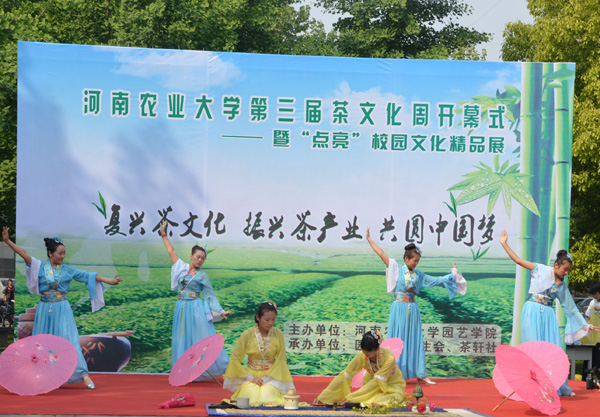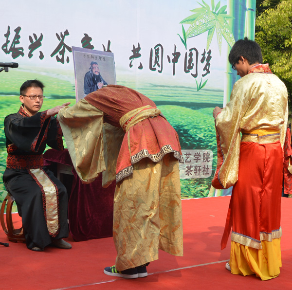 的同学们开始了精彩的演出,娇俏可人的少女们在《茶山情歌》的伴奏下,演绎了丰收采茶忙的动人场景;结合中国传统文化元素的书法、太极拳、武术、古筝以及长嘴壶茶艺表演,刚柔相济、动静结合、虚实相生,引人入胜;祭祀、宴客、拜师茶礼表演,将茶文化同中国作为礼仪之邦的礼紧密结合,古风深深,意蕴悠悠;主题茶艺表演《烟雨江南》再现宋代“执香捻茶”的场景,使观众充分感受到了茶文化在中国的源远流长;绿茶茶艺表演将演出带向高潮,茶艺队员优雅的气质,娴熟的技艺,扎实的基本功,赢得了在场嘉宾的广泛赞誉。开幕式结束后,程传兴书记寄语演职人员,他把人生比喻成茶,先苦后甜,鼓励同学们勤于专业,沏好人生的这杯茶。