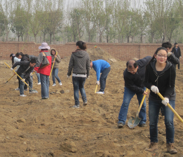 在植树现场,一派热火朝天的劳动场面。党委耿超明书记与师生一起,齐心协力地抬起一袋袋肥料,细心地施肥、垫土、扶苗、培土、浇水,一丝不苟地种下树苗。经过师生们三天的努力,在龙子湖新校区共种植桃、杏、石榴和核桃树800多棵。原本杂乱无章的荒草地,变成了整齐而又美观“桃李园”。