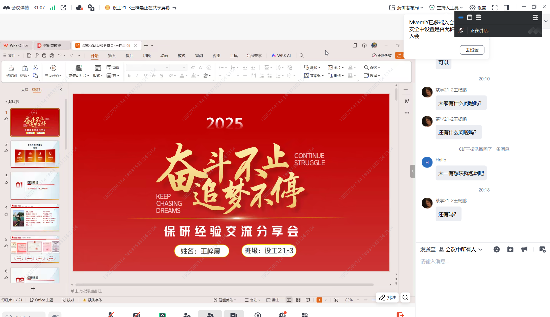 于线上举行“研途领航,经验传薪”考研保研经验交流会。会议邀请了2021级优秀学生代表王杨鹏、王梓晨、刘纹含、侯晓红、曾畅、陈雅欣分享学习经验,2022级辅导员乔芳芳和2022级全体同学参会。