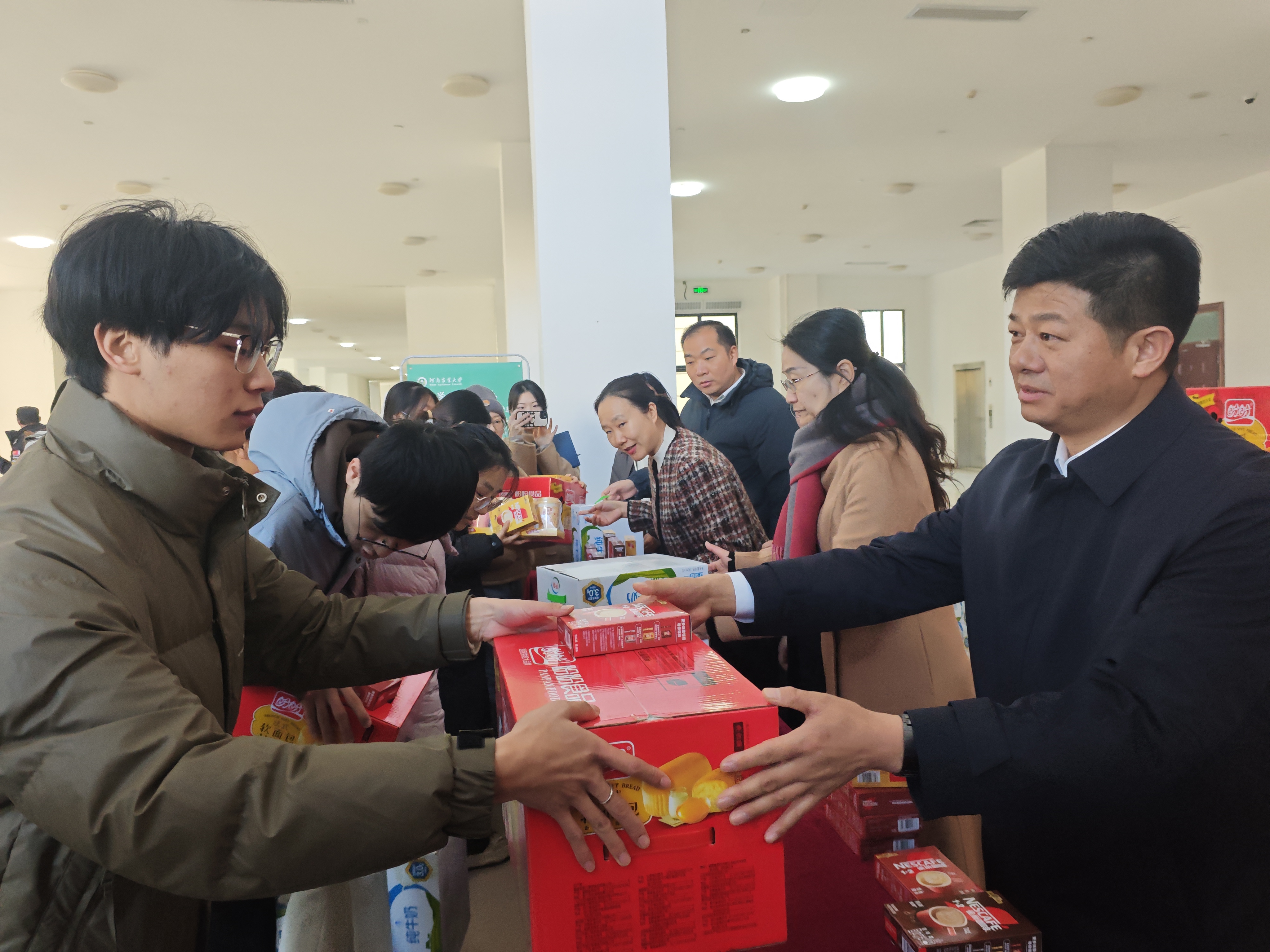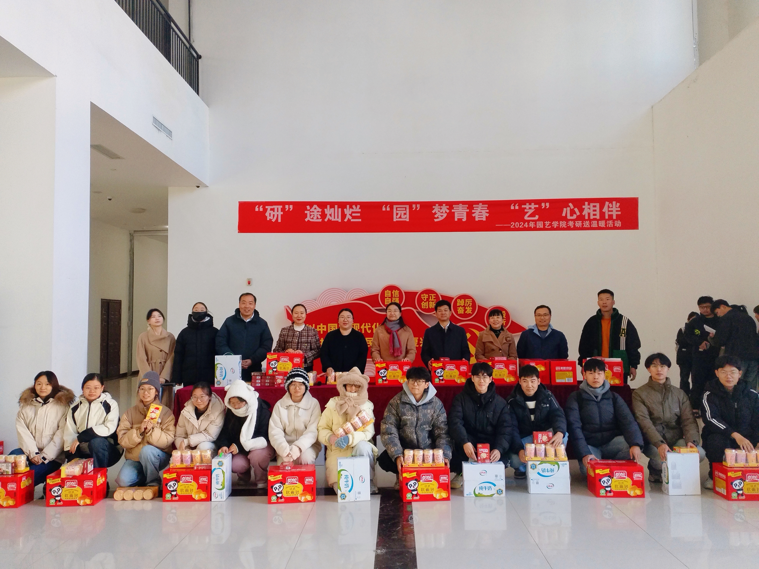 活动开始,秦素玲亲切慰问并鼓励考研学子:一是要坚定考研信心,全力冲刺坚持到底;二要注意劳逸结合,保持身体健康;三要学会释放压力,拥有良好心态,预祝学生展卷执笔如有神,心有所向志竟成!随后,院领导为考研学子送上牛奶、面包、奶茶、咖啡等暖心礼品,希望在寒冬为大家补充能量,保持学习动力。