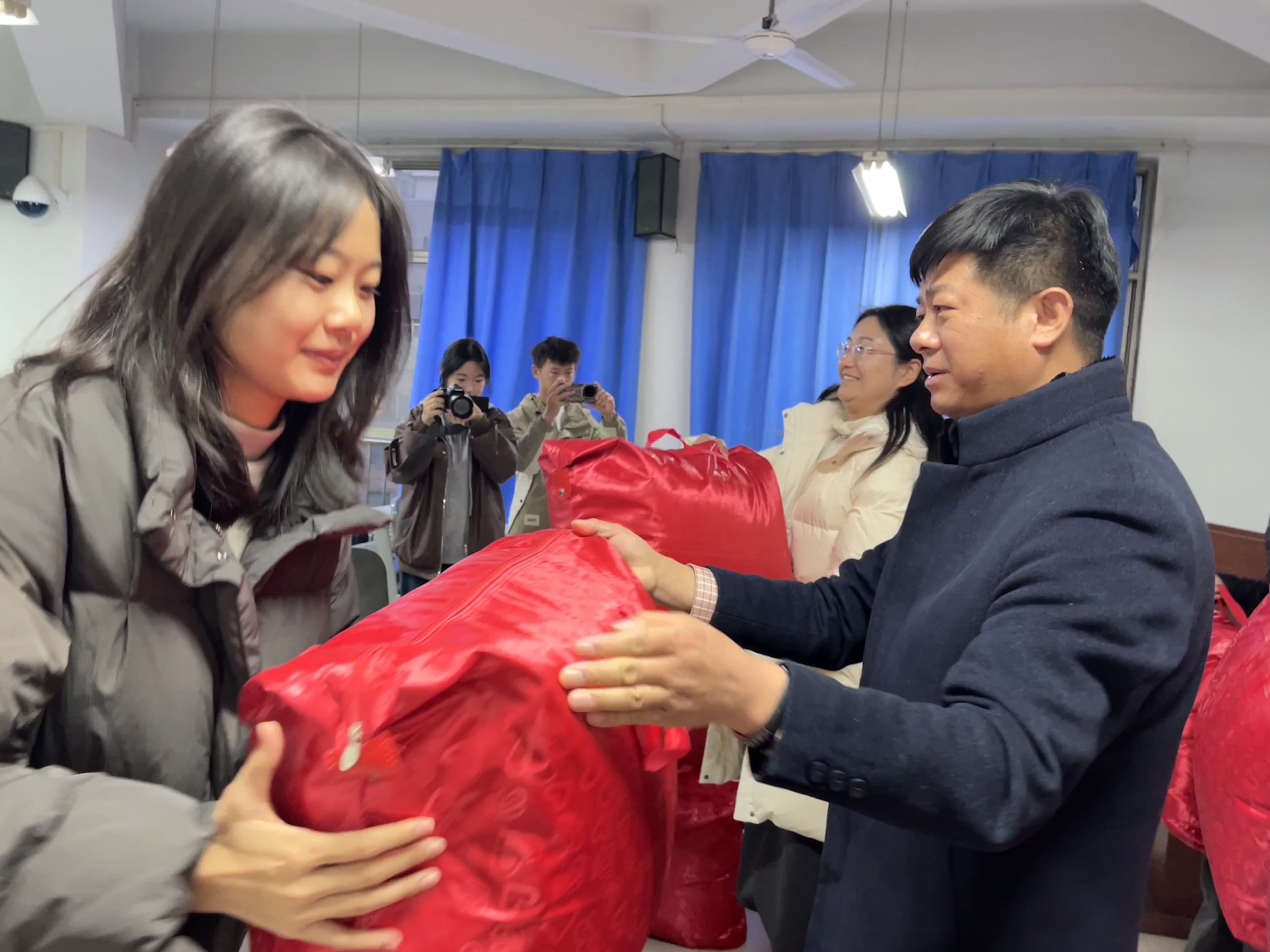 活动中,秦素玲与学生亲切交流,提醒学生天气寒冷,多注意保暖,叮嘱大家有困难要第一时间向学院班主任和辅导员老师反馈,肉番 永远是大家最坚实的后盾,最温暖的港湾。郑先波表示期末考试在即,希望学生能够在这个冬天满怀热忱,带着学院给予的温暖多多努力,在未来为园艺事业贡献自己的力量。活动最后,学院领导为24级本科生和研究生送上了精心准备的保暖棉被。