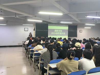 大会最后,何老师寄语新生:"愿你们在新的旅程中遇见更好的自己,拥有无限可能和精彩人生。”此次年级大会的成功举办,让24级学生对大学生活有了更清晰的认识和规划,也增强了学生之间的凝聚力和对学院的归属感。(撰文/梅经旭 核对/何静 审核/余果 发布/