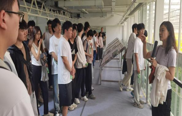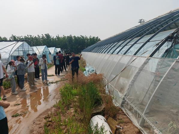 5月25日,学生们首先到达毛庄科教园区,设工系王吉庆教授结合线上企业发布的项目需求,引导大家实习过程要关注园区的规划设计、设施设备及造价、蔬菜种植模式及茬口安排等。接着,董晓星老师带领大家参观了智能化的温室大棚,介绍了温室的构造、环境调控系统以及智能化管理技术等。在老师们的指导下,学生们亲手操作了温室内的各种设备,学习了如何根据作物的生长需求调整温、光、水、气等环境因子。为深入了解日光温室及塑料大棚建造所需构件及造价,同学们深入河南省怡园温室材料有限公司进行考查,并与负责人深入沟通交流。