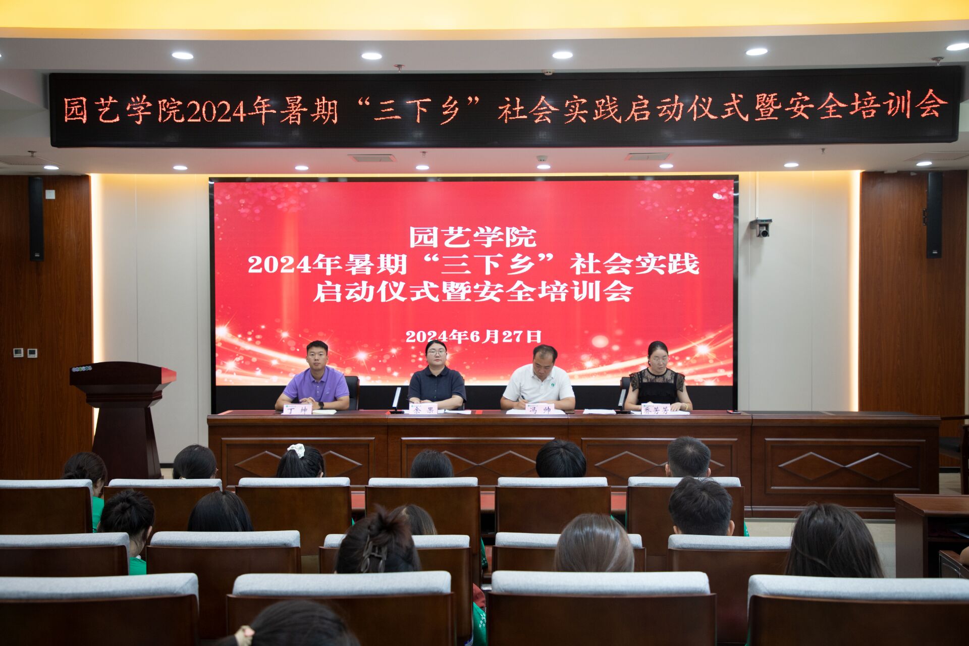 6月27日下午,肉番 在龙子湖校区力行楼北209报告厅举办2024年暑期"三下乡"社会实践活动的启动仪式暨安全培训会。院党委副书记余果出席,院团委书记冯帅、院团委副书记丁坤、2022级辅导员乔芳芳以及2023级和2022级社会实践团队代表参加,会议由冯帅主持。