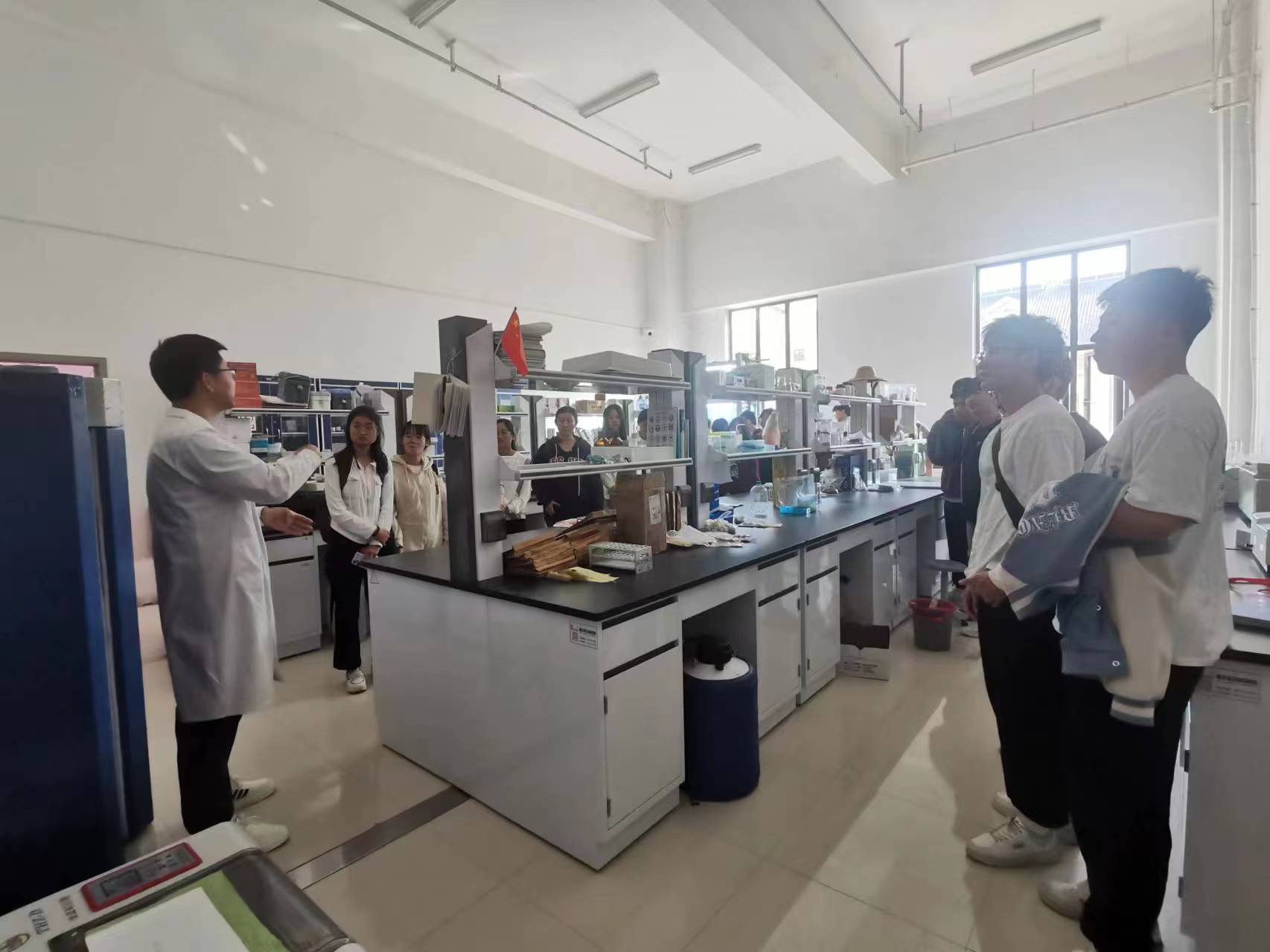 实验楼后,宽敞豁达的大堂以及明亮洁净的实验环境让学生们眼前一亮。学院各个团队的负责老师为同学们讲解了实验室相应器材的不同作用以及它们的具体使用方法。在这里,同学们见到了称量更精准的电子天平,过滤更高效的减压过滤器,使用更便捷的分光光度仪以及各种各样新奇又实用的实验器材,也了解了不同实验室所进行的不同的研究项目。同时,老师们也热情地邀请同学们积极报名科研助理,通过动手实践参与到学院的科研项目。在老师的讲解过程中,大家对未来的学习生活充满期待,更加憧憬在这样的学习环境中获取知识充实自己。