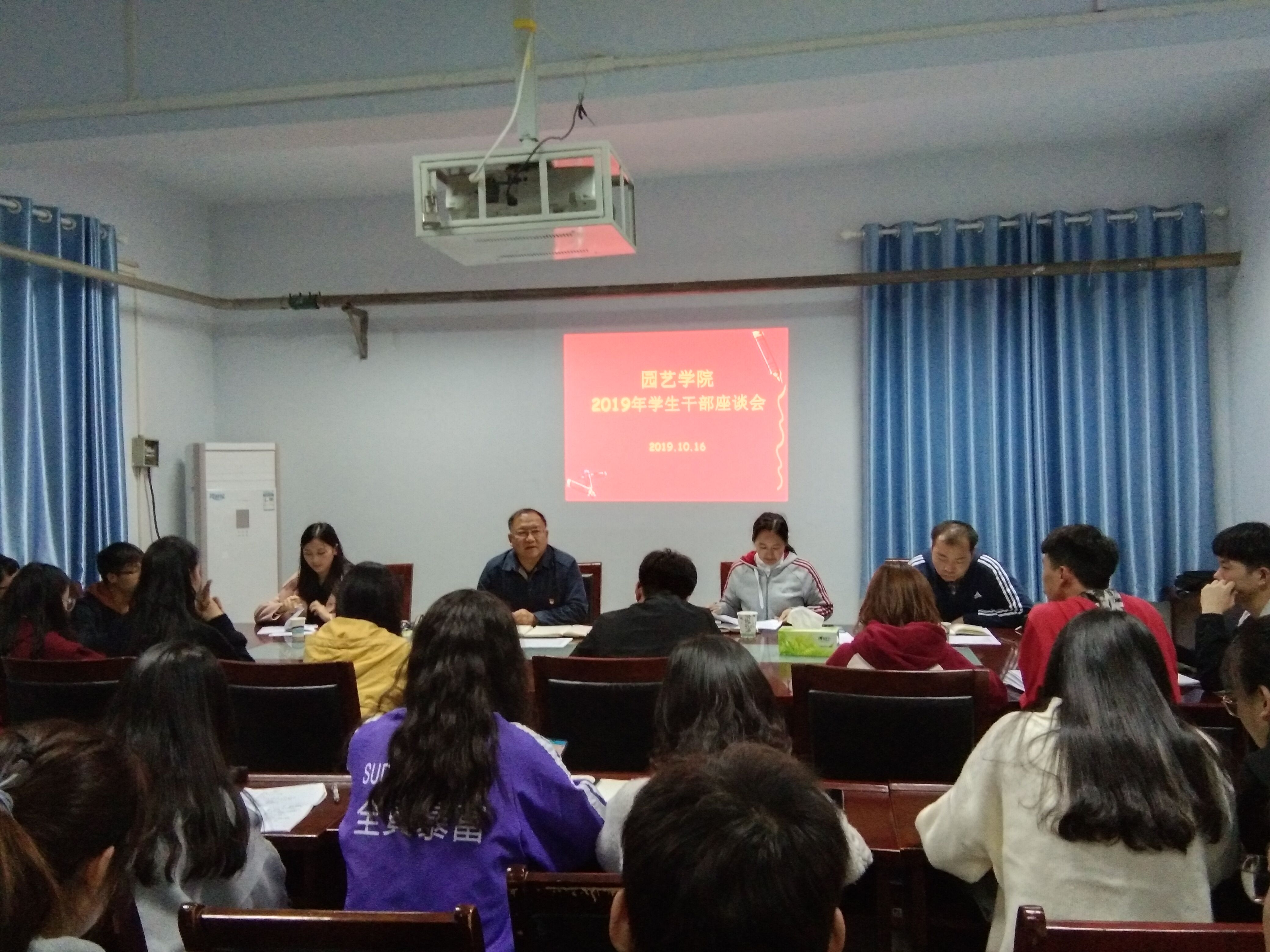10月16日,肉番 于文化路校区二号楼413会议室召开"肉番 2019年学生干部座谈会",院党委书记耿超明、院党委副书记侯亚兵、院团委副书记冯帅、18级辅导员陈桃以及团委学生会等主要学生干部参加。