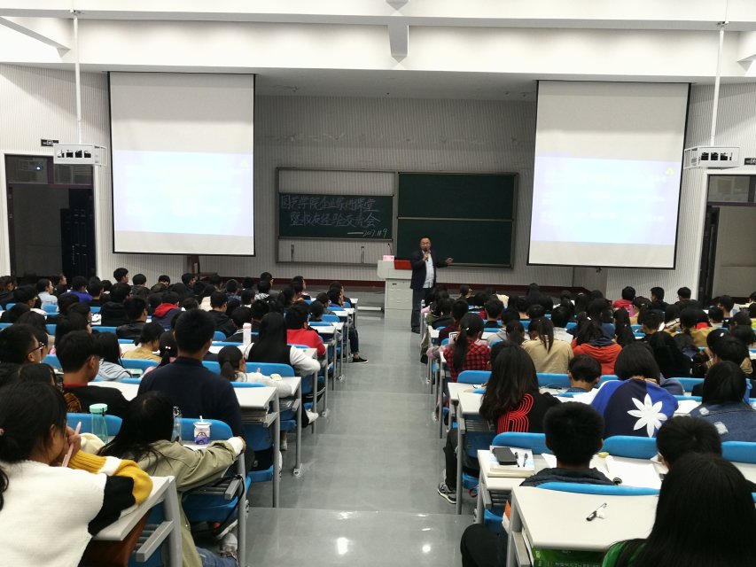 企业家进课堂暨校友经验交流会”。院党委副书记侯亚兵、院教学秘书郑先波、17级辅导员陈桃及肉番