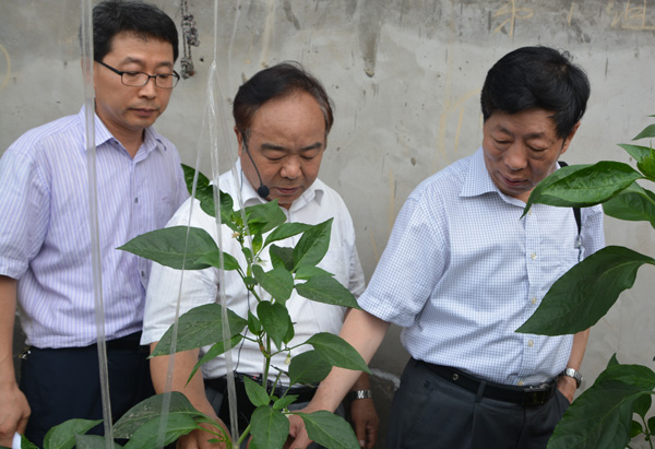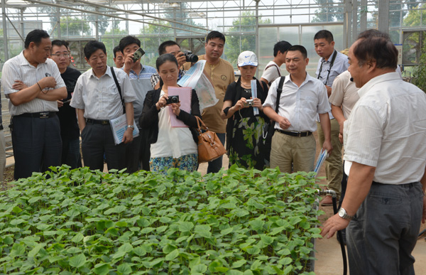 孙治强教授介绍了基地的基本情况和主要展示的内容,然后各位参会人员详细考察了每一个试验温室,示范专家介绍了各自展示技术的情况。考察之后,国家大宗蔬菜产业技术体系栽培与营养研究室的各位专家进行了前期工作总结和下一步工作安排。国家大宗蔬菜产业技术体系首席科学家杜永臣所长对示范基地展示的成果进行了充分肯定,认为进行蔬菜栽培新技术的集中示范展示在国内尚属首次,展示的大部分技术很具有推广意义,建议进一步加大示范基地的宣传力度,让国内更多的基地来参观学习。栽培与营养研究室主任喻景权教授代表体系对黄淮海岗位专家孙治强教授带领团队所付出的辛勤劳动表示感谢,同时安排了秋季的示范内容。