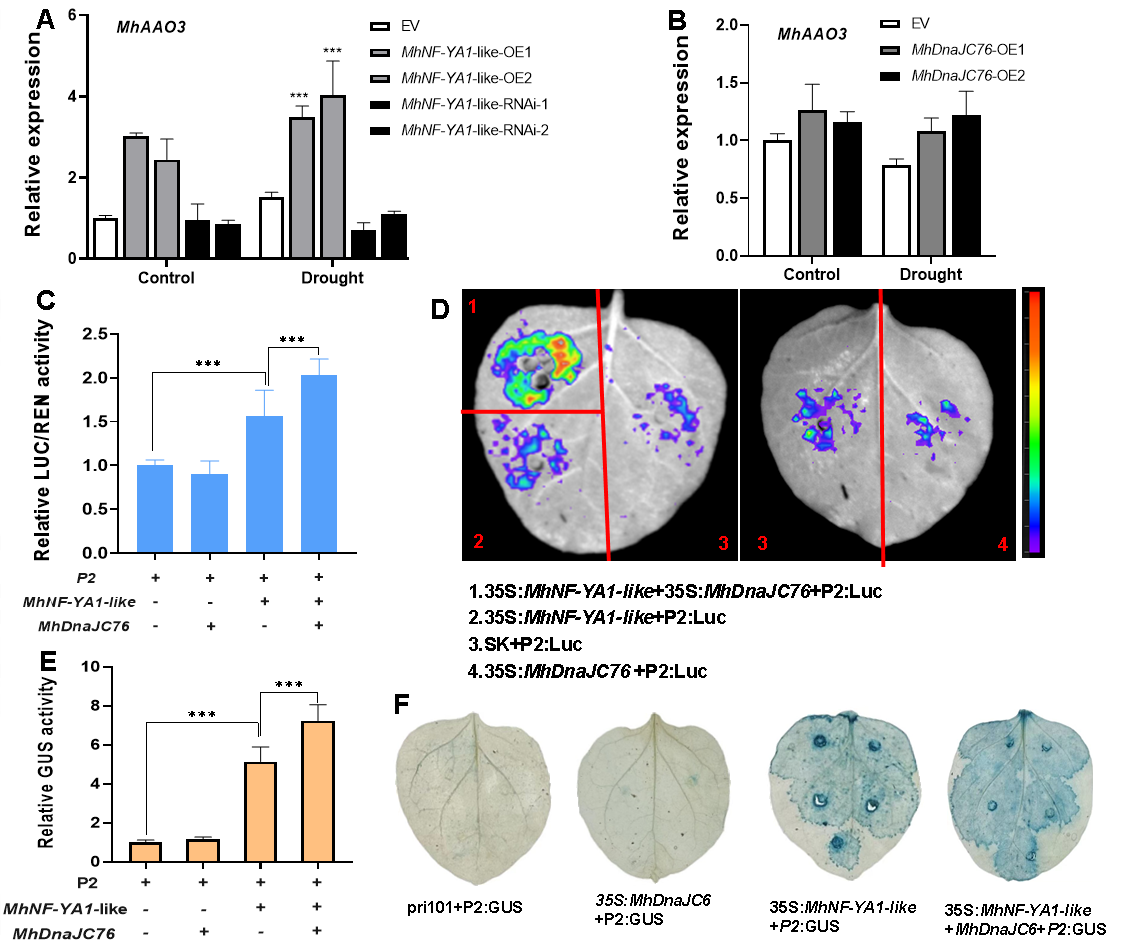 通过酵母文库筛选出了与MhNF-YA1-like互作的蛋白MhDnaJC76,并通过酵母双杂交实验回转验证两者互作,并双分子荧光互补实验和双荧光素酶互补实验验证了MhNF-YA1-like与MhDnaJC76蛋白互作。进一步通过单转和共转MhNF-YA1-like和MhDnaJC76了进行GUS和LUC分析,发现共转MhNF-YA1-like和MhDnaJC76促进MhNF-YA1-like调控
