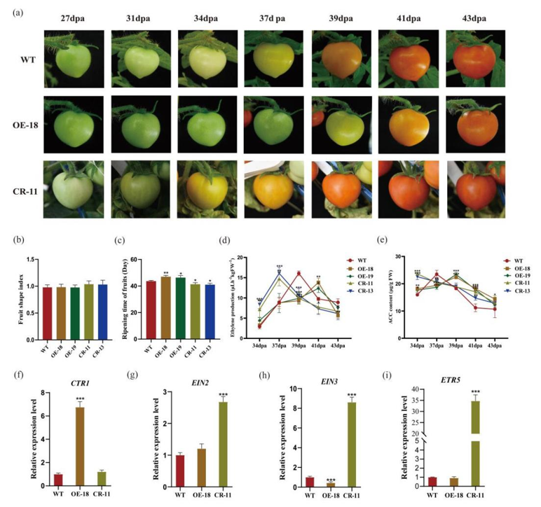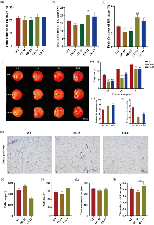 (OE),转基因番茄果实成熟延缓,并且果实硬度显著降低。相反,利用CRISPR/Cas9基因编辑