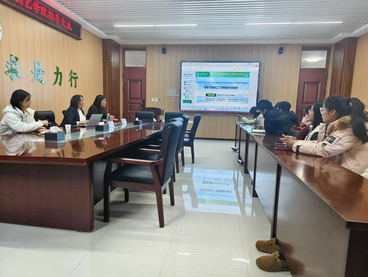 师生作“设施环控的底层逻辑和智能化案例”的学术报告。报告会由设施农业科学与工程系主任肖怀娟主持,学院教师和研究生共五十余人参加了报告会。