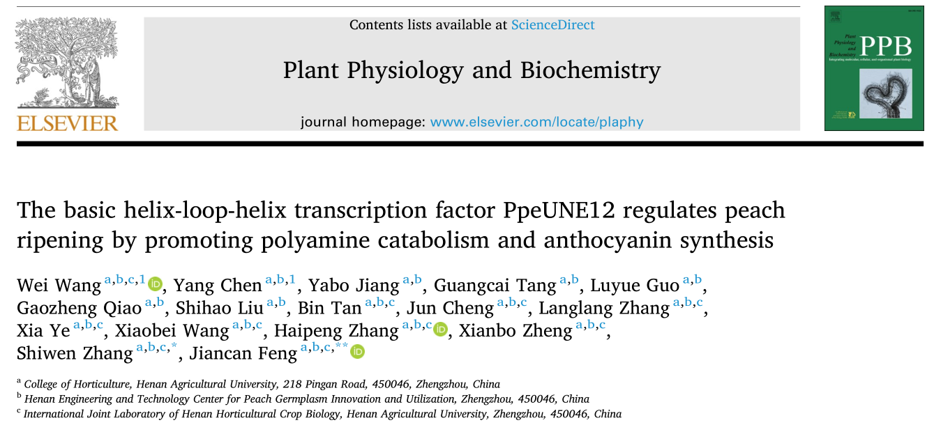 桃生物学与种质创新团队在Plant Physiology and Biochemistry发表了题为“The basic helix-loop-helix transcription factor PpeUNE12 regulates peach ripening by promoting polyamine catabolism and anthocyanin synthesis”的研究论文,报道了转录因子PpeUNE12 同时正向调控多胺分解和花青素合成,促进桃果实成熟,研究结果为桃果实成熟调控提供了理论基础和潜在基因资源。