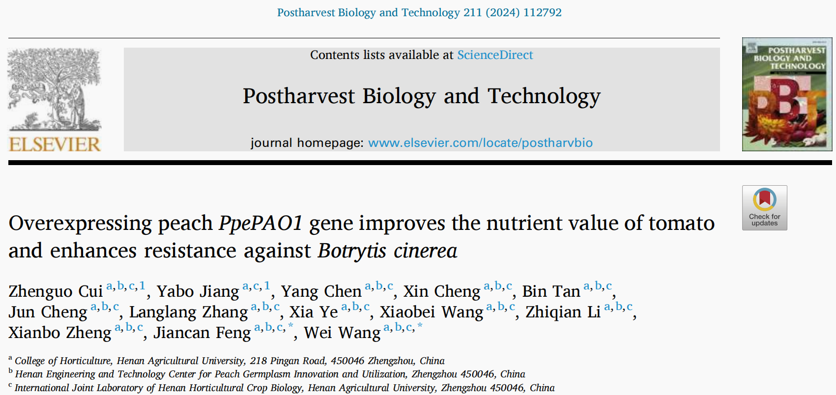 冯建灿教授领衔的桃生物学与种质创新团队在采后领域权威期刊《Postharvest Biology and Technology》上发表了题为“Overexpressing peach