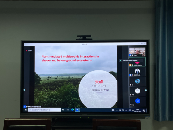 朱峰以《Plant-mediated multitrophic interactions in above- and below-ground ecosystems》为题,借用电影《The Happening》引出报告主题,以探索植物对于生物及非生物胁迫的应答机制以及其在塑造(农业)生态系统结构中的功能为目标,以陆地生态学为中心,通过生态基因组学、化学生态学等研究方法,结合室温、田间实验,解析了植物介导地上多营养级互作与调控机制、植物-土壤反馈效应的微生物驱动机制,进而探索了土壤遗赠效应对于土壤微生物群落和地上植物群落结构的影响和调控机制。