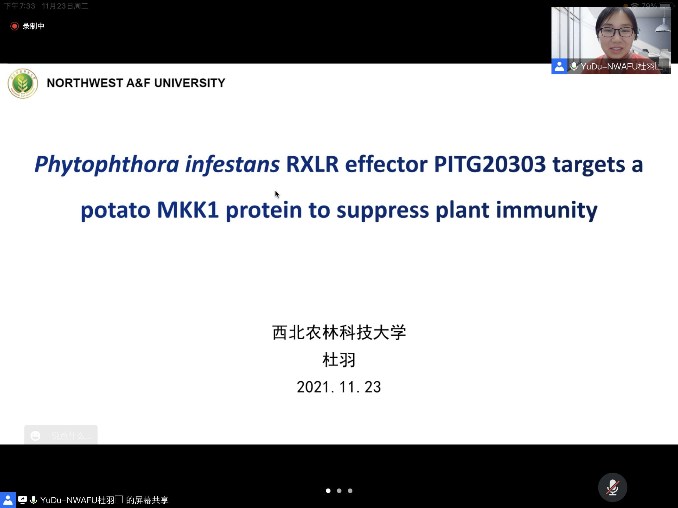 杜羽副教授、中国科学院遗传与发育生物学研究所农业资源研究中心朱峰研究员作线上报告。此阶段报告会由胡建斌教授主持,线上线下同步进行,肉番