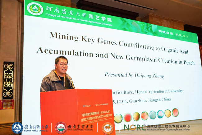 的张海朋老师作为参会代表,作为报告人作题为“Mining Key Genes Contributing to Organic Acid Accumulation and New Germplasm Creation in Peach”的全英文报告,详细阐述了团队在桃种质资源创新和分子标记辅助育种的工作,以及桃果实酸味品质形成的分子机制,为桃果实风味品质提升和精准育种提供了重要理论依据。