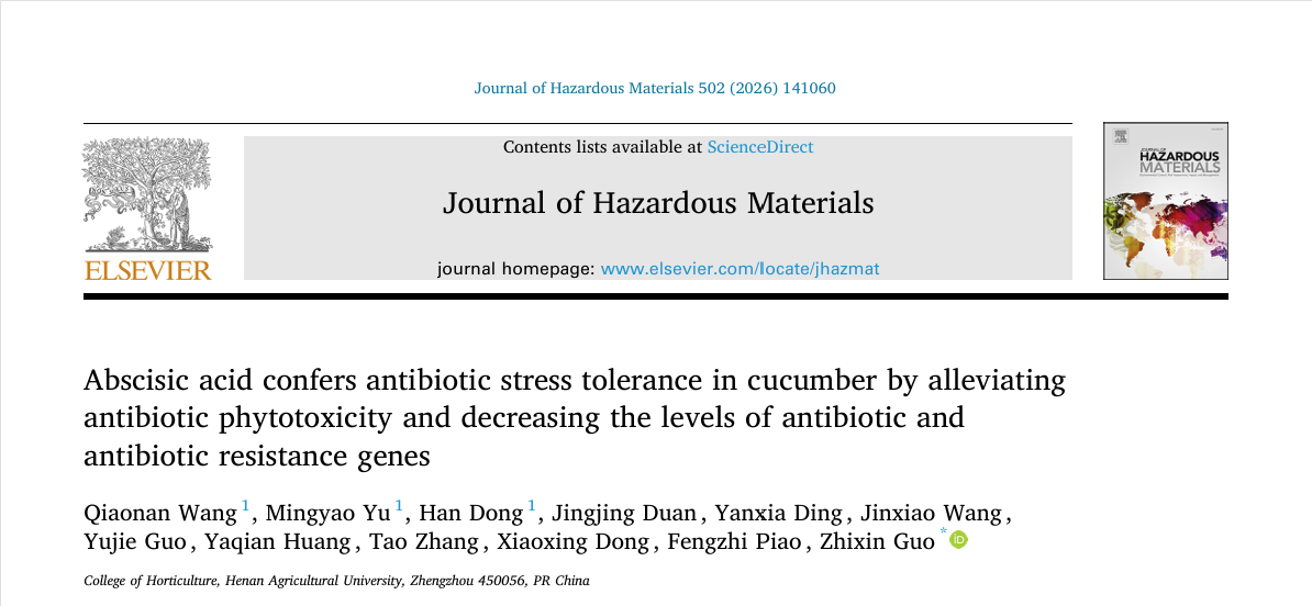 园艺设施结构与环境研究团队的研究成果“Abscisic acid confers antibiotic stress tolerance in cucumber by alleviating antibiotic phytotoxicity and decreasing the levels of antibiotic and antibiotic resistance genes”在国际环境科学与工程领域知名期刊Journal of Hazardous Materials (中科院1区Top,IF=11.3)在线发表。研究揭示了植物激素脱落酸消减黄瓜抗生素污染的新功能。研究结果为有效消减土壤-植物系统中抗生素累积及抗生素抗性基因传播提供了新思路。