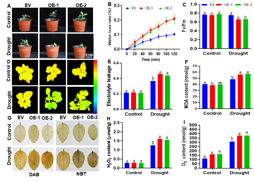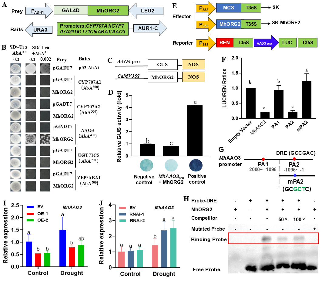 进一步研究发现MhORG2可以直接结合MhAAO3启动子中的DRE元件并抑制其表达,从而最终降低耐旱性。此外,MhORG2抑制抗氧化酶基因(MhSOD、MhAPX1和MhCAT)的表达,导致活性氧(ROS)的积累,从而降低苹果植株的耐旱性。我们的研究结果揭示了MhORG2负调控苹果植株抗旱性的新机制,为通过生物技术方法开发耐旱作物提供了潜在的靶点。