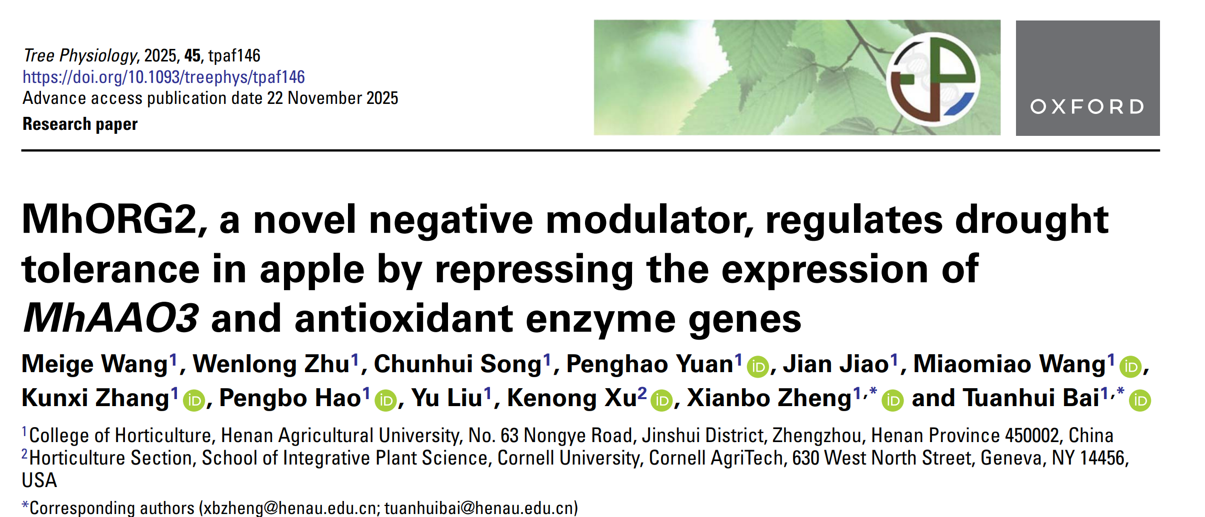 苹果逆境生物学与简约栽培技术团队在国际著名期刊Tree Physiology(中科院一区)发表了题为“MhORG2, a novelnegative modulator, regulates drought tolerancein apple by repressing the expressionMhAAO3and antioxidant enzyme genes”研究论文。该研究发现bHLH 转录因子MhORG2负调控苹果的抗旱性。