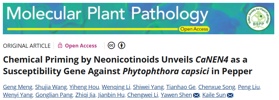 的茄科抗病抗逆与种质创新团队在国际知名植物病理学期刊《Molecular Plant Pathology》(中科院一区Top)上发表了题为“Chemical Priming by Neonicotinoids UnveilsCaNEN4as a Susceptibility Gene AgainstPhytophthora capsiciin Pepper”的研究论文。该研究首次阐明,常用新烟碱类杀虫剂吡虫啉(IMI)和噻虫嗪(TMX)不仅能防治害虫,还能通过激发植物自身的系统性免疫反应来增强辣椒对毁灭性病害——辣椒疫病(Phytophthora capsici)的抗性。尤为关键的是,研究团队鉴定出一个名为CaNEN4的辣椒感病基因,其功能丧失可显著增强抗病性,为培育广谱、持久抗病的辣椒新品种提供了全新的分子靶点。